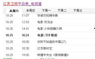 你有没有发现,每天晚上坐在沙发上,看着电视,突然间就迷上了江苏影视频道的节目?那感觉,就像是找到了一个宝藏库,里面藏着各种精彩纷呈的电影、电视剧和综艺节目。今天,就让我带你一起探索这个宝藏库的秘密,揭秘江苏影视频道的节目表!